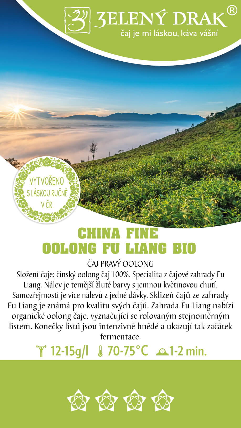 Složení čaje: čínský oolong čaj 100%. Specialita s rovnoměrným listem. Nálev je temější žluté barvy s jemnou květinovou chutí. Samozřejmostí je více nálevů z jedné dávky. Čaj pochází z kontrolovaného ekologického zemědělství.