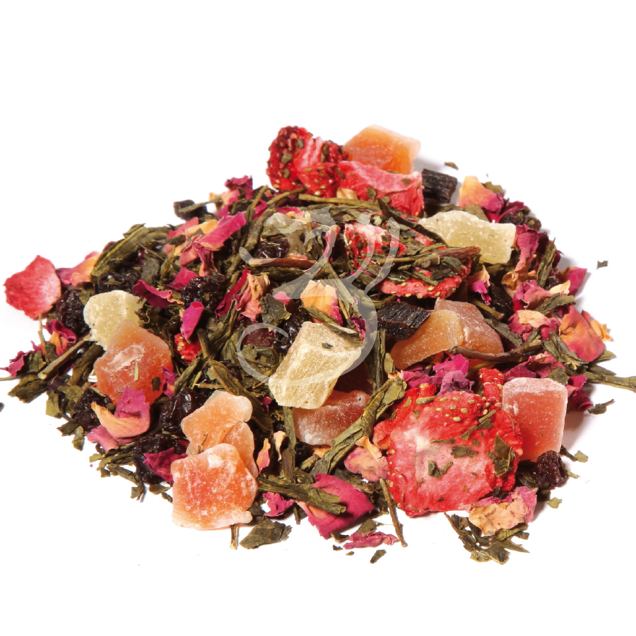 Složení čaje: zelený čaj Čína Sencha, papája (papája, cukr), ananas (ananas, cukr), hroznové víno (hroznové víno, zeleninový olej), přírodní aroma, kousky jahod, plátky růží, kousky malin, bourbon vanilka, třešeň.