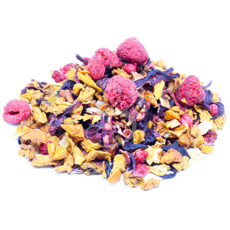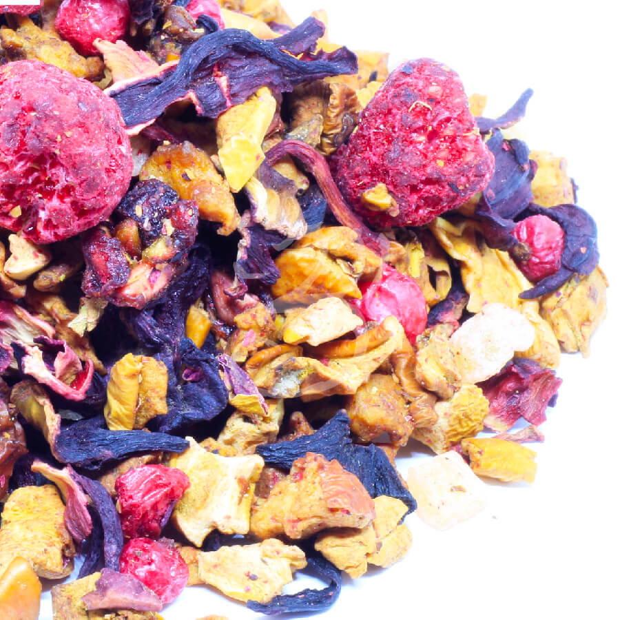 Složení: kousky jablek, květy ibišku, kostky ananasu (ananas, cukr), fialové kostky dračího ovoce (dračí ovoce, rýžová mouka), aroma, acai kostky (3%) (ovoce acai, jablko, koncentrát jablečné šťávy, rýžová moučka, okyselovač: kyselina citronová), mrazem sušené maliny, okvětní lístky růží, semena granátového jablka, mrazem sušený červený rybíz.