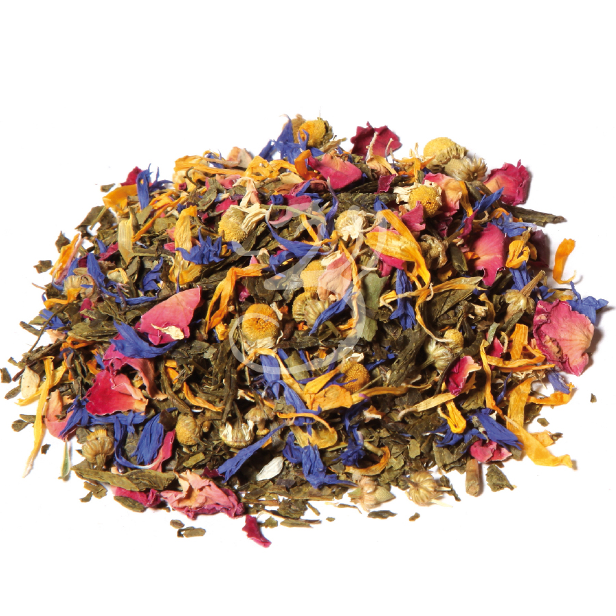 Složení: zelený čaj Čína Sencha, pomerančové kousky, květy heřmánku, jahodové plátky, okvětní lístky slunečnice, žluté lístky měsíčku lékařského, modré lístky chrpy, růžová poupata růží.