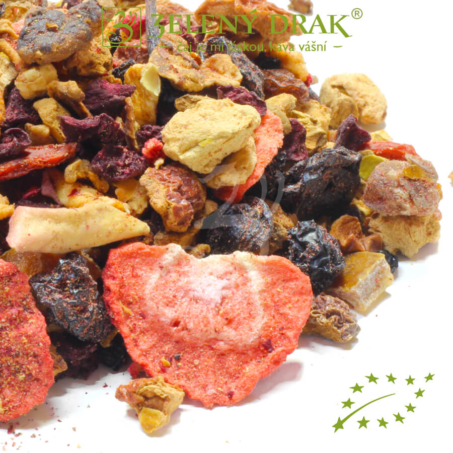 Složení čaje: kousky jablek*, datle (datle, rýžová mouka)*, červená řepa*, fíky (fíky, rýžová mouka) *, hroznové víno (hrozny, rostlinný olej)*, banán (banán, kokosový olej, třtinový cukr, med)*, bezinky*, Aronie*, višně*, mango*, goji berry*, jablečné čtvrtky*, physalis*, jahody*, maliny*, ostružiny*. * označené přísady pochází zkontrolovaného ekologického zemědělství .