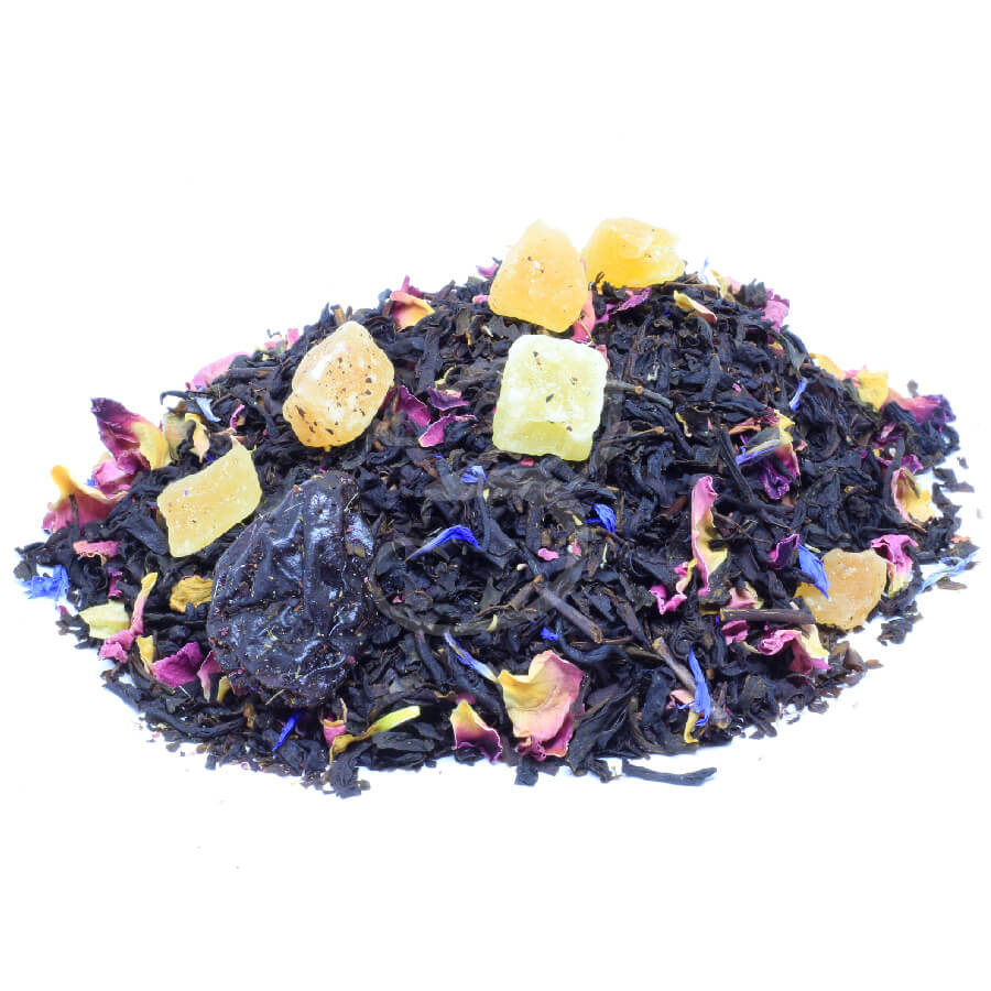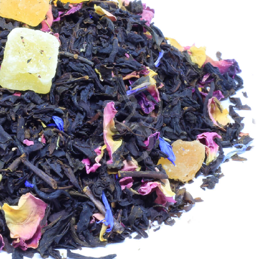 Složení čaje: černý čaj Cejlon, -Jižní Indie, -Čína, ananas (ananas, cukr), papája (papája, cukr), hroznové víno (hroznové víno, rostlinný olej), okvětní lístky růží (7%), přírodní aroma, chrpa modrá.