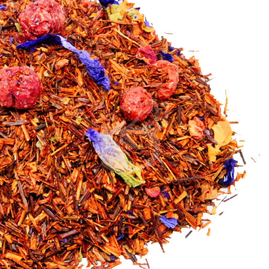 Složení čaje: rooibos, aroma, květy slézu, mrazem sušený červený rybíz, mrazem sušené kousky malin, semínka granátového jablka.