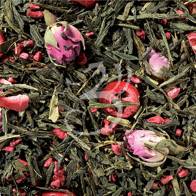Složení čaje: zelený čaj (87 %), poupata růží, mrazem sušené malinové kousky, aroma, mrazem sušené plátky brusinek
