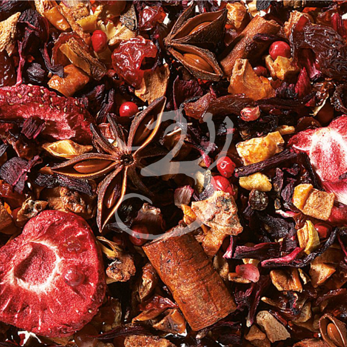 Složení: kousky jablek, květy ibišku, šípkové slupky, tyčinky skořice, celý badyán, kousky zázvoru, růžový pepř, aroma, mrazem sušené plátky jahod, hřebíček.