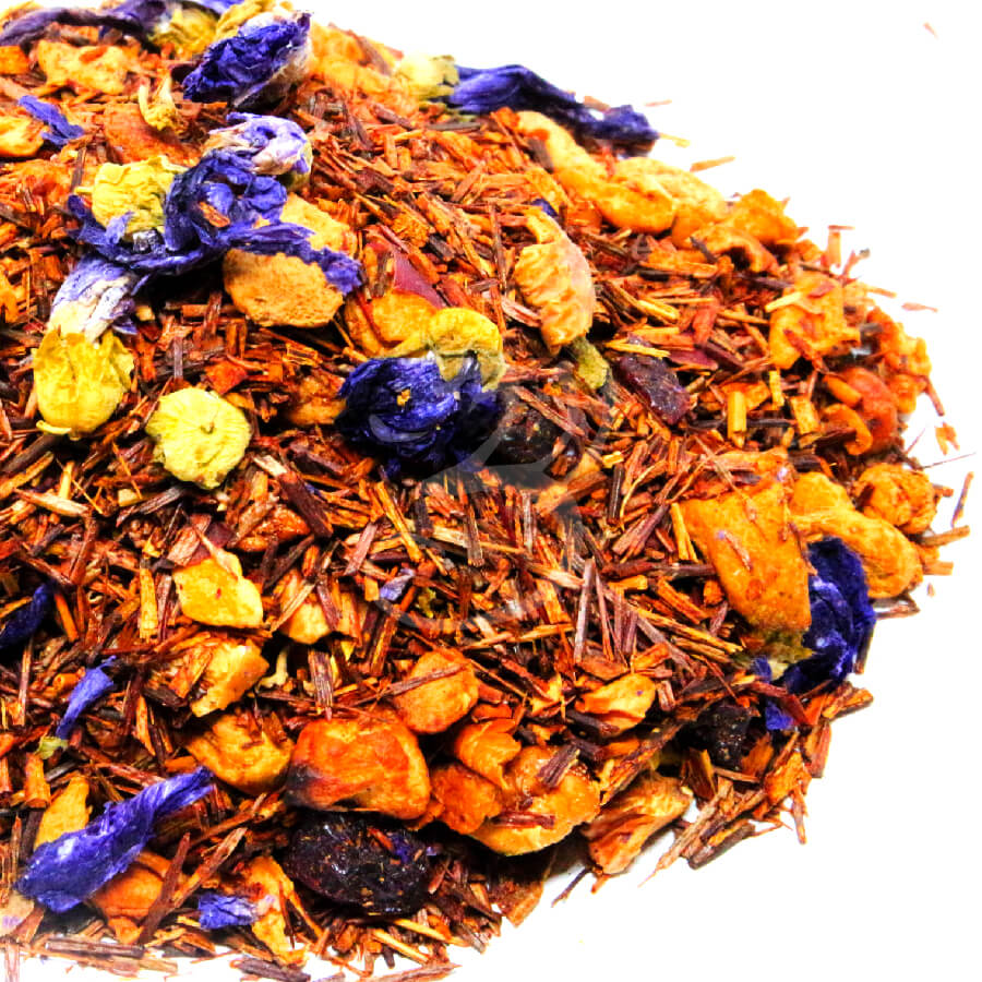Letní čaj se stinným nádech podzimu. Šťavnaté, letní třešňové tóny a sladké švestkové tóny jsou doprovázeny kousky višní a švestek na našem jemném rooibosovém základu a jsou dokonale doplněné podzimními kousky jablek a květy slézu.