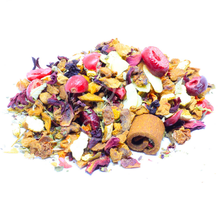 Složení: kousky jablek, pomerančová kůra, květy ibišku, listy ostružin, plátky mandlí, strouhaná mrkev, badyán, tyčinky skořice, květy limetky stříbrné, aroma, mrazem sušená jablka, pomerančová kůra, kousky brusinek, semínka granátového jablka, okvětní lístky růží.
